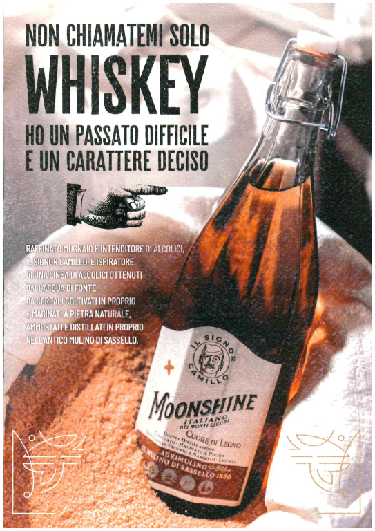 Produttore: Azienda Agricola Il Signor Camillo. Sede: Via G. Badano, 31, 17044 Sassello (SV), Liguria, Italia. Tipologia: Distillato di cereali affinato (Moonshine). Formato: Bottiglia da 50 cl. Grado Alcolico: 40% vol. Ingredienti: acqua, distillato di cereali, aromi naturali derivanti dal legno. Allergeni: NESSUNO.