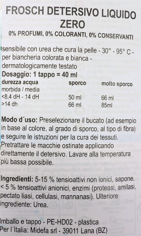 Frosch Zero% Sensitive Detergent assicura, grazie alla sua formulazione ipoallergenica e delicata sulla pelle con Urea che si prende cura della pelle, un elevato potere lavante da 30° a 95°C. Poiché non contiene coloranti, oli profumati e aggiunta di conservanti, è particolarmente adatto per pelli sensibili e persone con allergie.