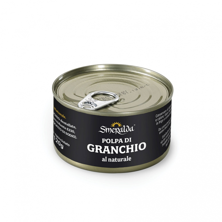 Ingredienti: polpa di GRANCHIO dentellato (60% polpa, 40% chele), acqua, sale zucchero, antiossidante E330, conservante E223 (metabisolfito di sodio)