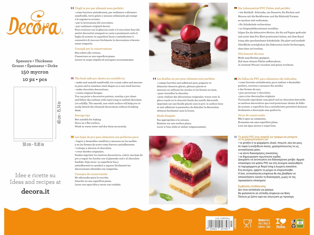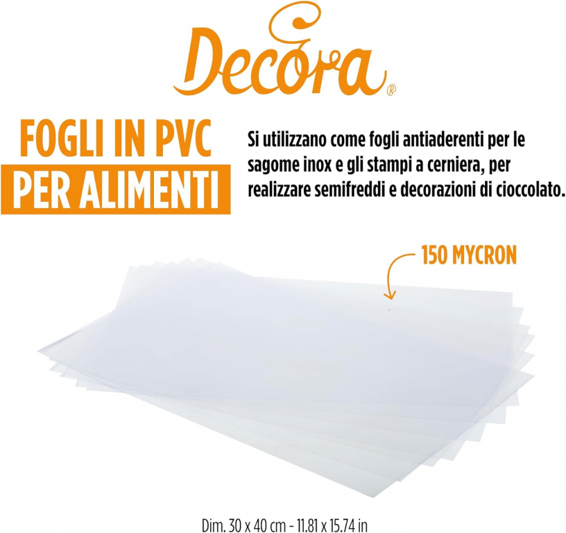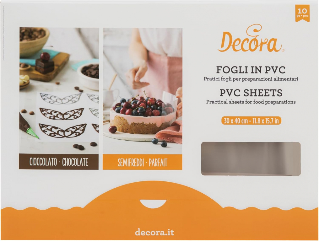 I fogli in pvc per alimenti sono perfetti: come barriera antiaderente, per realizzare e sformare semifreddi, torte gelato e mousse utilizzando gli stampi e le sagome in acciaio; per la lavorazione del cioccolato; per realizzare originali decori.