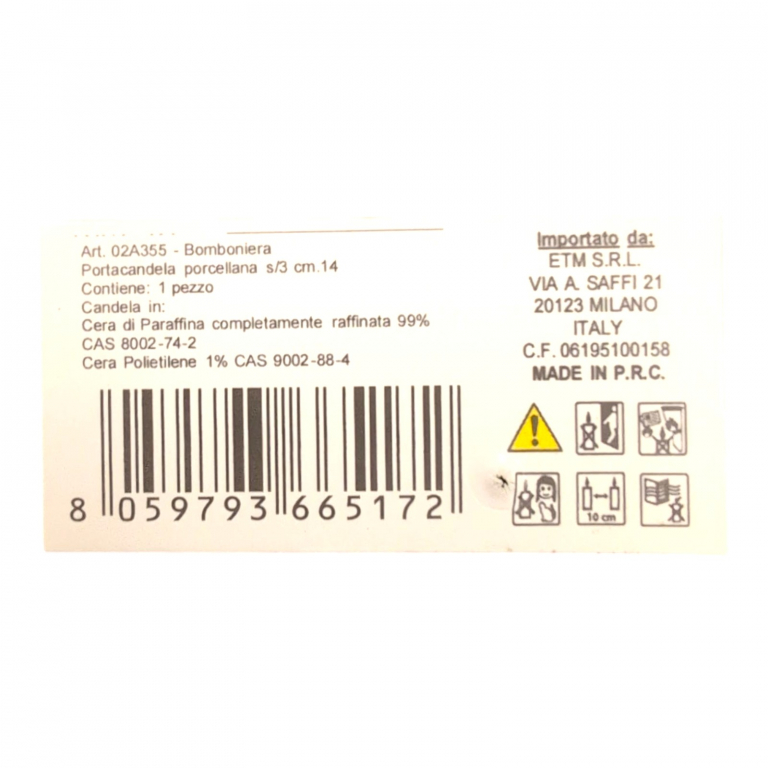 Per la composizione di ogni singola candela attenersi all’etichetta esposta sul prodotto. Qualora fosse stata tolta e gettata contattateci per necessità scrivendo una mail a info@etm.it