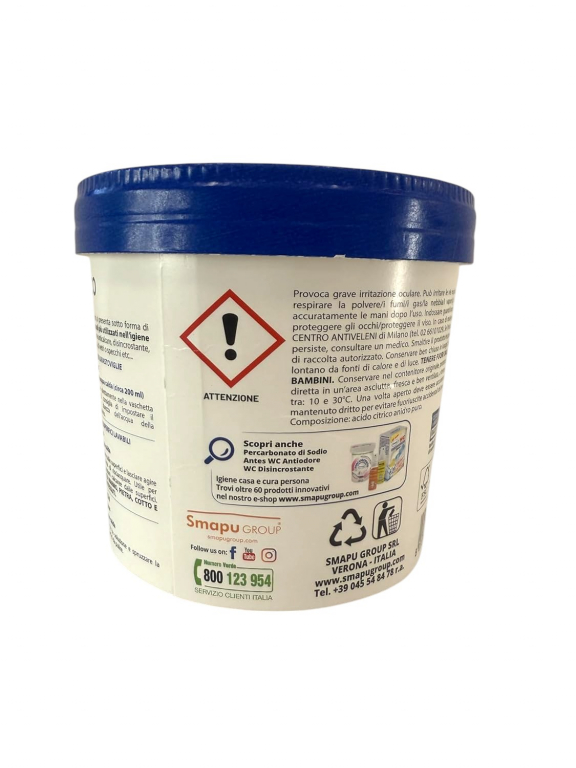 TENERE FUORI DALLA PORTATA DEI BAMBINI. Utilizzare soltanto all'aperto o in un luogo ben ventilato. Indossare guanti/indumenti protettivi/proteggere gli occhi/proteggere il viso. In caso di malessere, contattare un CENTRO ANTIVELENI/un medico. IN CASO DI CONTATTO CON GLI OCCHI: Sciacquare accuratamente per parecchi minuti. Togliere le eventuali lenti a contatto se è agevole farlo. Continuare a sciacquare. Se l'irritazione degli occhi persiste, consultare un medico. Conservare sotto chiave. Smaltire il prodotto/recipiente in un punto di raccolta autorizzato. Contiene: acido citrico.
