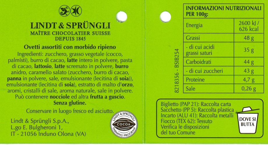 Produttore: Lindt & Sprüngli. Tipologia: Assortimento di ovetti di cioccolato con morbido ripieno. Gusti Inclusi: Latte, Bianco e Caramello Salato. Formato: Sacchetto da 320 g. Caratteristiche e Benefici: