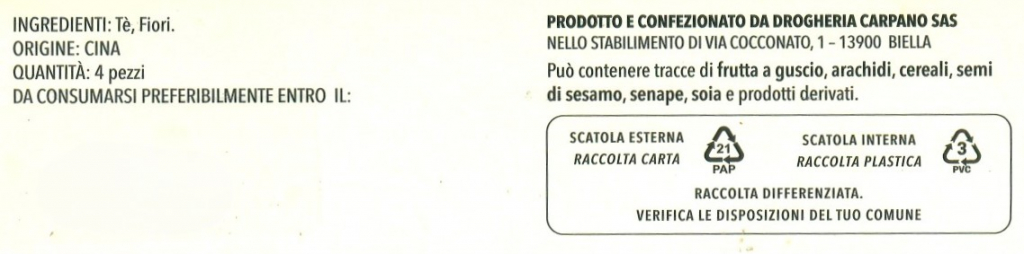 Prodotto e confezionato da D. Carpano nello stabilimento di Via Cocconato, 1 13900 Biella