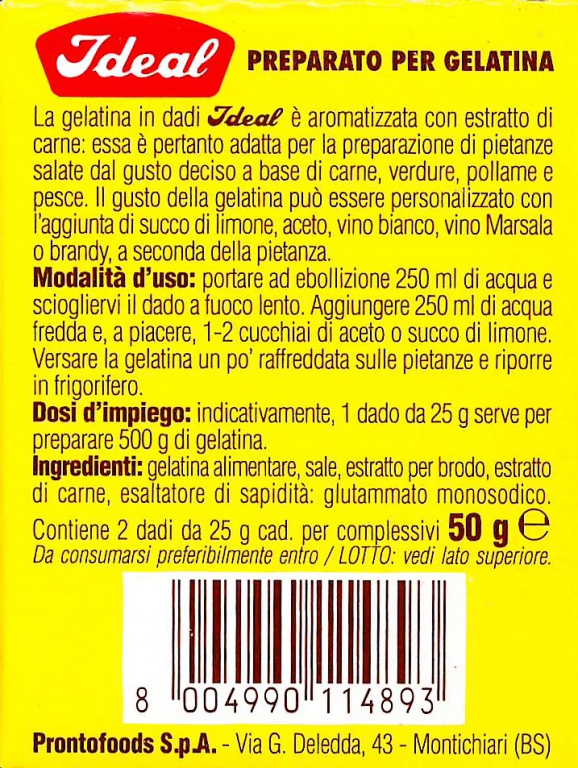 - Ingredienti: Gelatina alimentare, sale, estratto per brodo, estratto di carne, esaltatore di sapidità: glutammato monosodico.