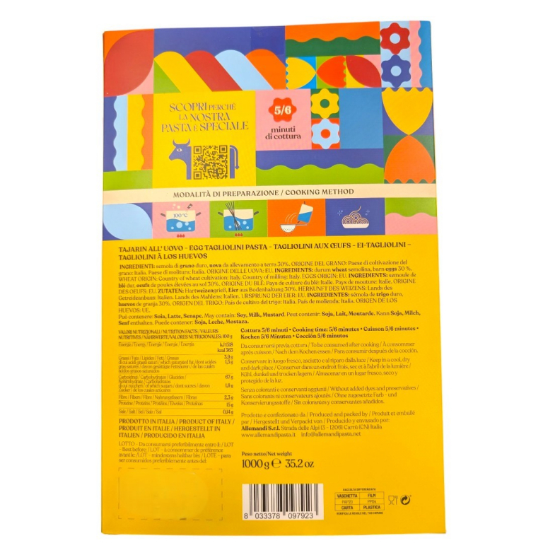 Ingredienti: Semola di grano duro italiano, uova italiane da allevamento a terra 30%