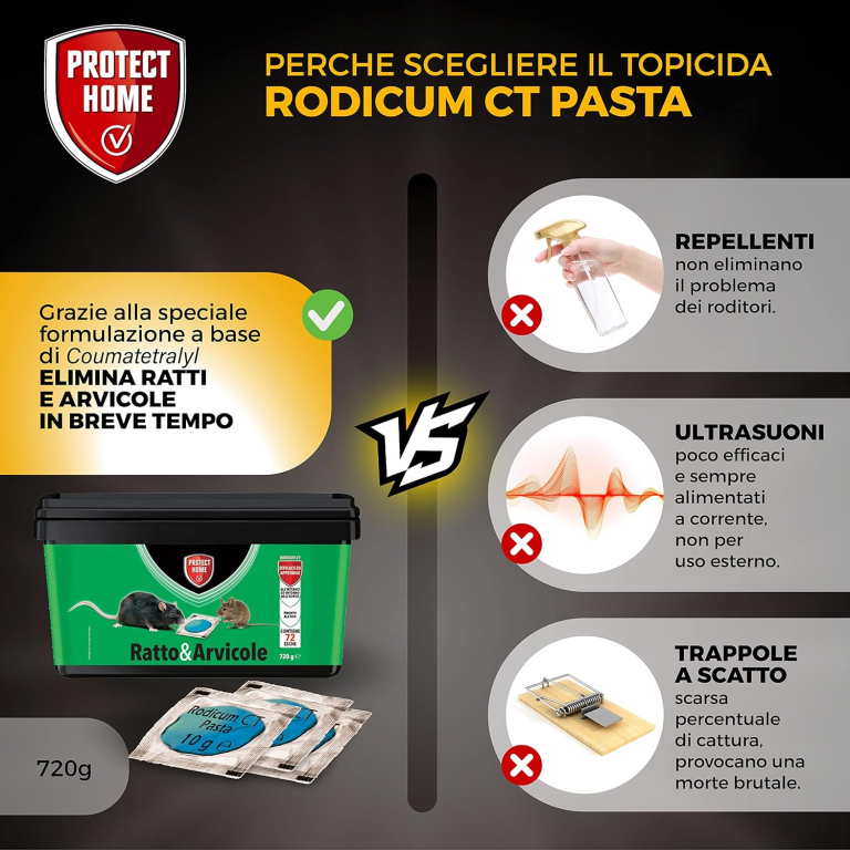 Tipologia: Esca rodenticida in pasta fresca pronta all'uso. Prodotto autorizzato per uso non professionale (domestico). Principio Attivo: Coumatetralyl 0,0027%. È un anticoagulante che agisce in modo rapido ed efficace. Azione: Grazie all'elevata appetibilità della pasta, permette il controllo dell'infestazione in breve tempo, eliminando ratti e arvicole. Target: Ideale per il controllo di: