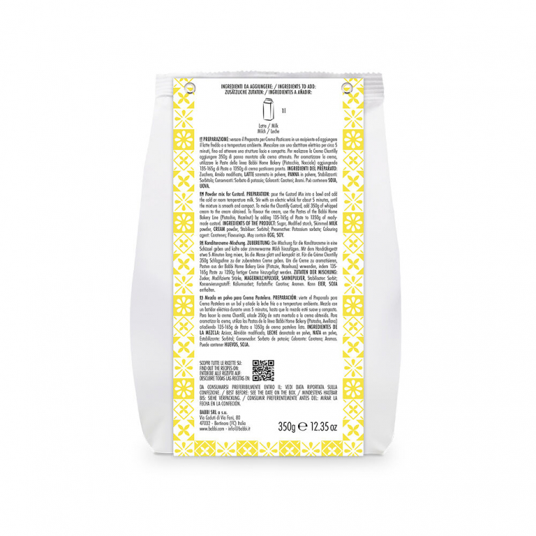 Preparato in polvere per la preparazione di crema pasticcera a freddo SENZA UOVA e SENZA GLUTINE: in pochi minuti potrai gustare una crema delicata e vellutata, ottima da mangiare tal quale e ideale anche per la farcitura di tartellette e dessert. Per una versione ancora più golosa puoi aromatizzarla con le Paste Babbi Home Bakery. Visita la sezione RICETTE per trovare golose idee per i tuoi dessert. ISTRUZIONI DI CONSERVAZIONE: Tutti i prodotti della linea Babbi Home Bakery, una volta aperti, possono essere conservati a temperatura ambiente fino alla data di scadenza riportata sulla confezione. Si raccomanda di utilizzare sempre utensili (spatole, cucchiai, ecc.) puliti e asciutti per prelevare polveri / paste/ salse dalle confezioni.