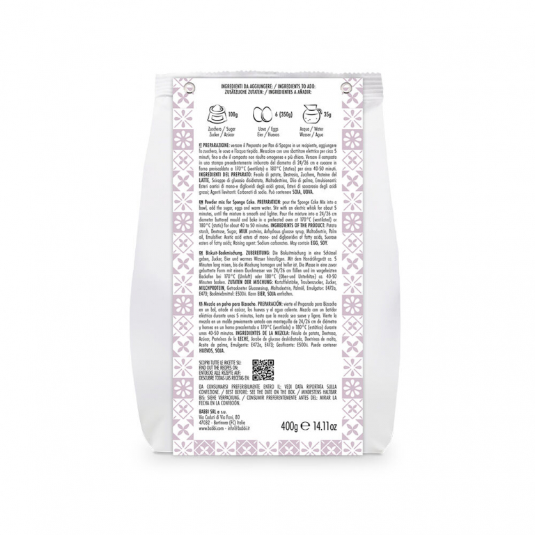 Prodotto in polvere per la realizzazione di un soffice Pan di Spagna SENZA GLUTINE sia nel forno tradizionale che nel microonde. Buono tal quale con una semplice spolverata di zucchero a velo, oppure farcito con panna o crema pasticcera. Con l'aggiunta all'impasto delle Paste Babbi Home Bakery puoi ottenere delle varianti aromatizzate originali e golose. Prova anche la versione al cacao o la versione sottile, perfetta per la realizzazione di golosi pan rollè. Nella sezione RICETTE potrai trovare tante idee semplici e golose! ISTRUZIONI DI CONSERVAZIONE: Tutti i prodotti della linea Babbi Home Bakery, una volta aperti, possono essere conservati a temperatura ambiente fino alla data di scadenza riportata sulla confezione. Si raccomanda di utilizzare sempre utensili (spatole, cucchiai, ecc.) puliti e asciutti per prelevare polveri / paste/ salse dalle confezioni.