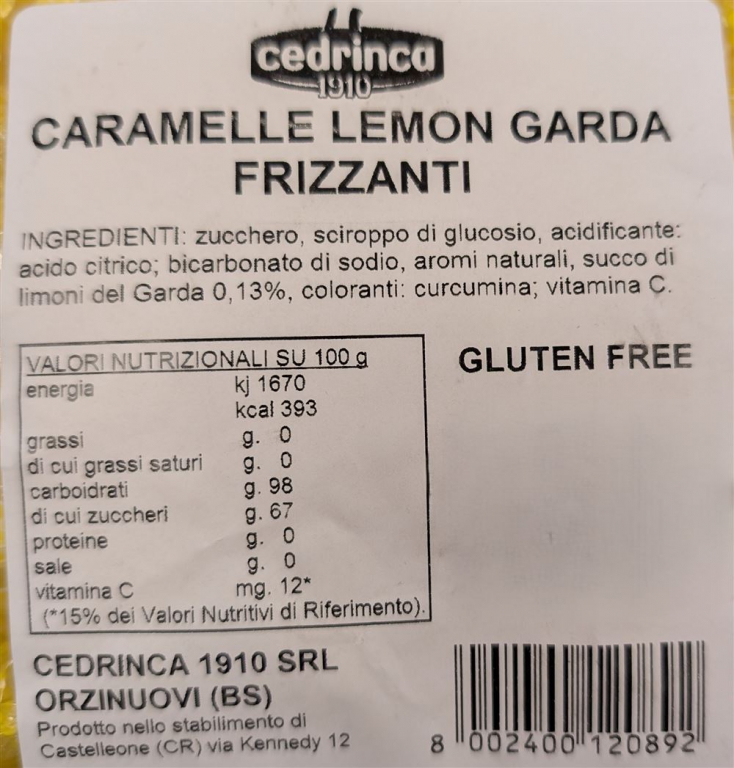 Produttore: Cedrinca. Sede: Salò (BS), Lombardia, Italia. Tipologia: Caramelle dure farcite con polvere frizzante al limone. Formato: Busta da 1 kg. Ingredienti: Zucchero, sciroppo di glucosio, acidificanti (acido citrico), bicarbonato di sodio, aromi naturali, succo di limone del Garda 0,13%, coloranti curcumina, vitamia C. Allergeni: Assenti. Senza glutine.
