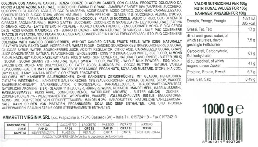 Produttore: Amaretti Virginia S.r.l. Sede: Sassello (SV), Liguria, Italia. Tipologia: Prodotto dolciario da forno a lievitazione naturale. Formato: Confezione regalo da 1000 g. Ingredienti: farina di FRUMENTO, amarene candite 17% (amarene, sciroppo di glucosio-fruttosio, zucchero, succo di amarena, concentrato vegetale: carota nera e ibisco, correttore di acidità: acido citrico, aromi naturali), glassa 11% (zucchero, albume d’UOVO, zucchero in granella, NOCCIOLE, MANDORLE, farina di riso), BURRO, TUORLO d’UOVO fresco, zucchero, lievito naturale (FRUMENTO), sciroppo di glucosio, emulsionanti: mono- e digliceridi degli acidi grassi, burro di cacao, LATTE scremato in polvere, sale, aromi naturali. Allergeni: FRUMENTO (GLUTINE), UOVA, LATTE, BURRO, NOCCIOLE, MANDORLE. PUÒ CONTENERE TRACCE DI ALTRA FRUTTA A GUSCIO E SOIA.