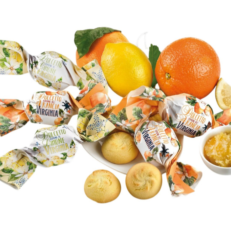 Produttore: Amaretti Virginia. Sede: Sassello (SV), Liguria, Italia. Tipologia: Pasticceria di frolla ripiena. Formato: Confezione da 500 g. Ingredienti: farina di GRANO – ripieno al limone e all’arancia 36% (purea e cubetti di limone 48%, sciroppo di glucosio-fruttosio, scorze D’ARANCIA 20%, zucchero, acqua, addensante: amido modificato di tapioca, gelificante: pectina, stabilizzante: glicerolo, correttore di acidità: acido citrico, conservante: potassio sorbato, aromi) – BURRO (LATTE) – zucchero – TUORLO D’UOVO – pasta di limone e arancia canditi 3% (scorze di limone e arancia 49%, sciroppo di glucosio-fruttosio, zucchero, correttore di acidità: acido citrico, conservante: ANIDRIDE SOLFOROSA) – farina di mais – agenti lievitanti: pirofosfato di sodio, bicarbonato di sodio, amido di GRANO – conservante: potassio sorbato – sale – aromi. Allergeni: GRANO (GLUTINE), LATTE, BURRO, UOVO, ANIDRIDE SOLFOROSA. PUÒ CONTENERE TRACCE DI NOCI, NOCCIOLE, MANDORLE, PISTACCHI, SOIA E SENAPE.
