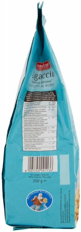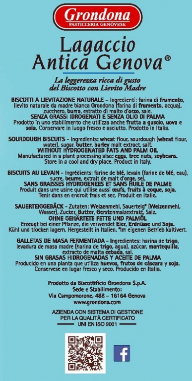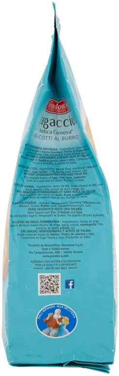 - Ingredienti: Farina di frumento, lievito naturale (da madre bianca Grondona), zucchero, burro (12%) e malto d'orzo.