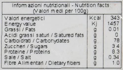 Valori energetici Kcal 317 = 1340 Kj, Grassi 0.8 g – di cui acidi saturi grassi: 0.8 g – Carboidrati 59 g – Zuccheri 1.5 g – Fibre alimentari 15 g – Proteine 11 g – Sale 0.39 g