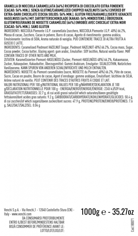 GRANELLA DI NOCCIOLA CARAMELLATA (66%) RICOPERTA DI CIOCCOLATO EXTRA FONDENTE (CACAO: 56% MIN.). SENZA GLUTINE INGREDIENTI: NOCCIOLA Piemonte IGP caramellata (zucchero, NOCCIOLA Piemonte IGP 48%) 66.2%, Massa di cacao, Zucchero, Cacao in polvere, Burro di cacao, Agente di rivestimento: gomma arabica, Emulsionante: lecitina di SOIA, Aroma naturale di vaniglia. PUÒ CONTENERE TRACCE DI ALTRA FRUTTA A GUSCIO E LATTE.