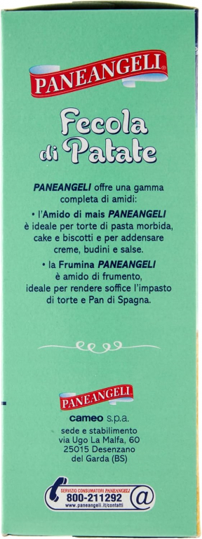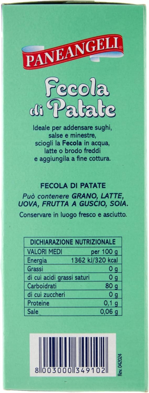 La Fecola di Patate PANEANGELI è il caratteristico amido da tuberi di patate. Finissima e impalpabile, si usa soprattutto nella preparazione di dolci più delicati e dall’impasto friabile e leggero oppure come addensante per creme, sughi, salse e minestre