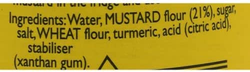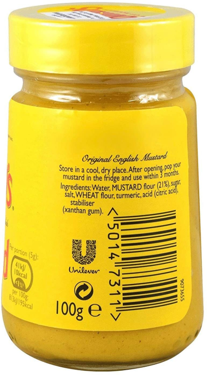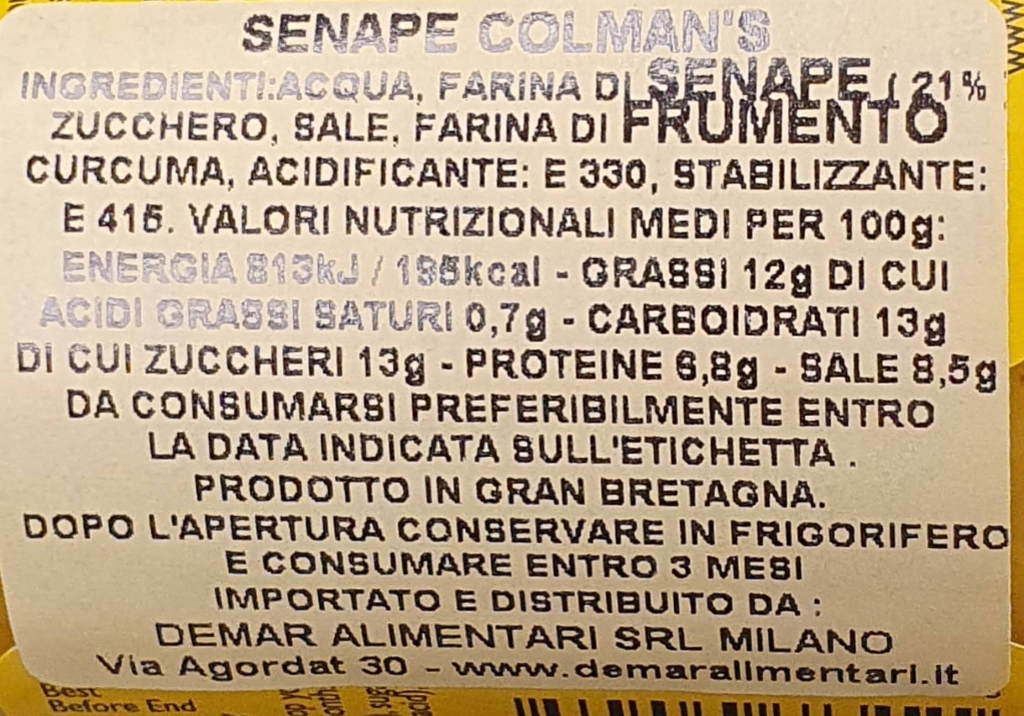 Produttore: Colman’s of Norwich (Unilever). Sede: Norwich, Norfolk, Inghilterra (Regno Unito). Tipologia: Senape inglese in polvere o pasta (Double Superfine). Formato: Barattolo da 100 g. Ingredienti: acqua, farina di SENAPE (21%), zucchero, sale, farina di FRUMENTO, spezie (curcuma), correttore d'acidità (acido citrico), stabilizzante (gomma di xantano). Allergeni: SENAPE, FRUMENTO (GLUTINE).