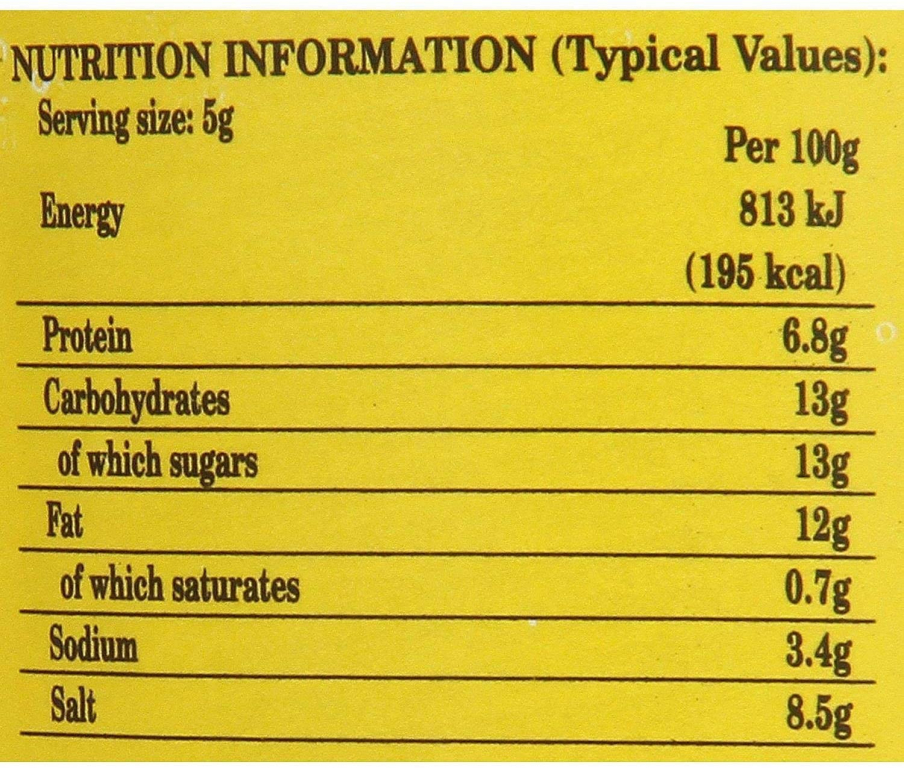 Valori nutrizionali medi per 100 g: Valore energetico: 815 kJ - 195 kcal Grassi 12 g di cui acidi grassi saturi 0,7 g Carboidrati 13 g di cui zuccheri 13 g Fibre 1,1 g - Proteine 6,8 g - Sale 8,5 g