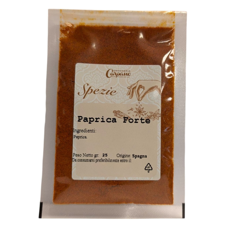 La Paprica Forte è una spezia in polvere ottenuta da peperoni piccanti essiccati e macinati, inclusi i semi e i filamenti che contengono la capsicina, responsabile del suo distintivo sapore piccante. Questa spezia aggiunge un tocco di calore e un aroma intenso ai tuoi piatti, senza sovrastarli.