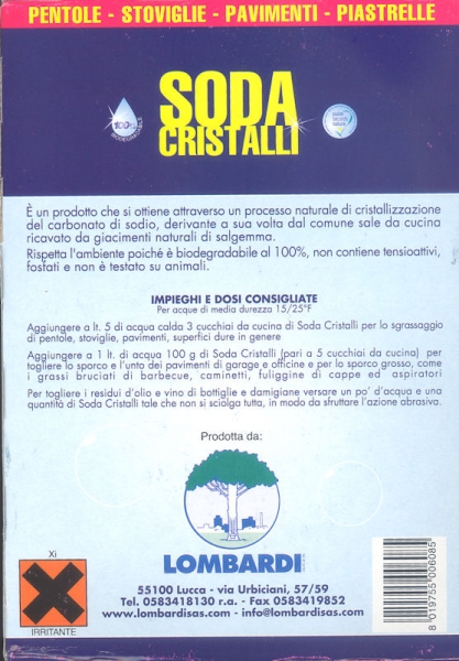 Produttore: Lombardi S.r.l Viale San Concordio, 388 55100 Lucca LU (Italy)Tel. 0587 354365 Tipologia: Carbonato di Sodio (Soda da bucato). Formato: Confezione da 1 kg. Caratteristiche e Benefici:
