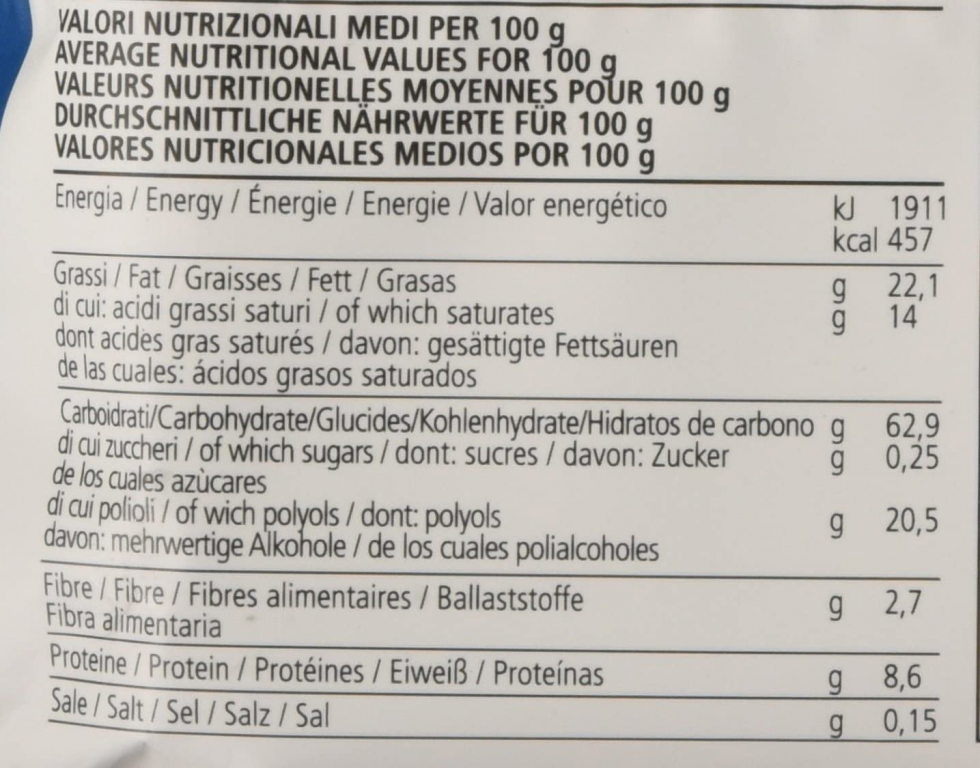 Valore energetico kj 1911/kcal 457,grassi 22,1 g di cui acidi grassi saturi 14 g, carboidrati 62,9 g di cui zuccheri 0,25 g di cui polioli 20,5 g, fibre 2,7 g, proteine 8,6 g sale 0,15 g.