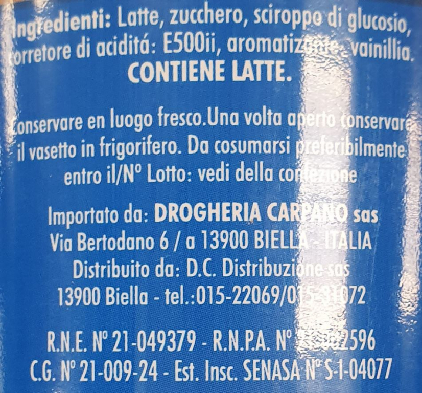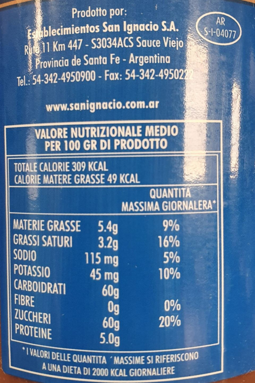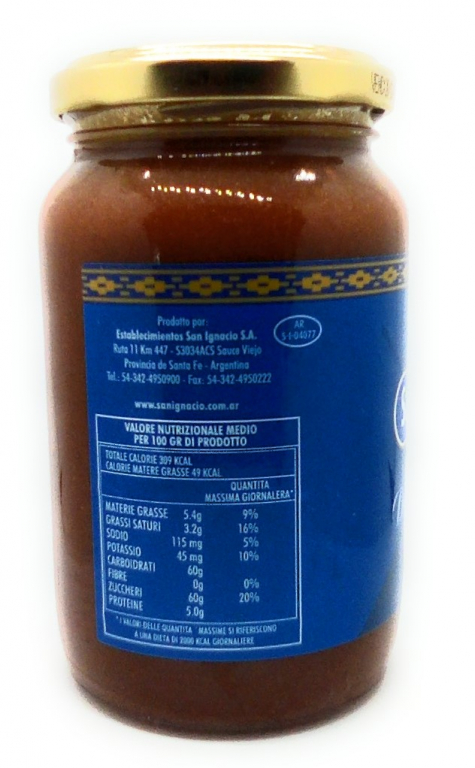 Produttore: Establecimientos San Ignacio S.A. Sede: Sauce Viejo (Santa Fe), Argentina. Tipologia: Crema spalmabile a base di latte e zucchero. Formato: Vasetto in vetro da 450 g. Ingredienti: Latte intero, zucchero, latte scremato in polvere, sciroppo di glucosio, addensante: agar-agar, aroma naturale di vaniglia. Allergeni: Latte. Senza Glutine (Gluten Free).