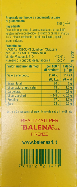 Ingredienti: sale commestibile iodato, grasso di palma, esaltatore di sapidità (glutammano monosodico), estratto di carne di manzo 13%, cipolle essiccate, carote essiccate, spezie, aroma naturale