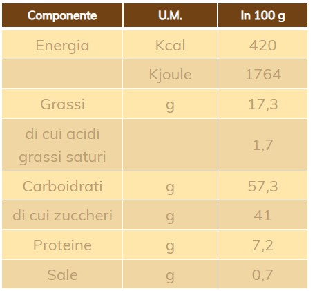 Ingredienti: Scorze d’arancia candite, cedro e melone canditi (Frutta, Sciroppo di glucosio-fruttosio, Saccarosio, Acidificante: acido citrico), Mandorle, Zucchero (zucchero, amido di mais), Farina di grano tenero “0”, Sciroppo di zucchero invertito, Miele, Miscela di spezie, Ostie (Fecola di patate). Può contenere tracce di soia, nocciole, noci e latte.