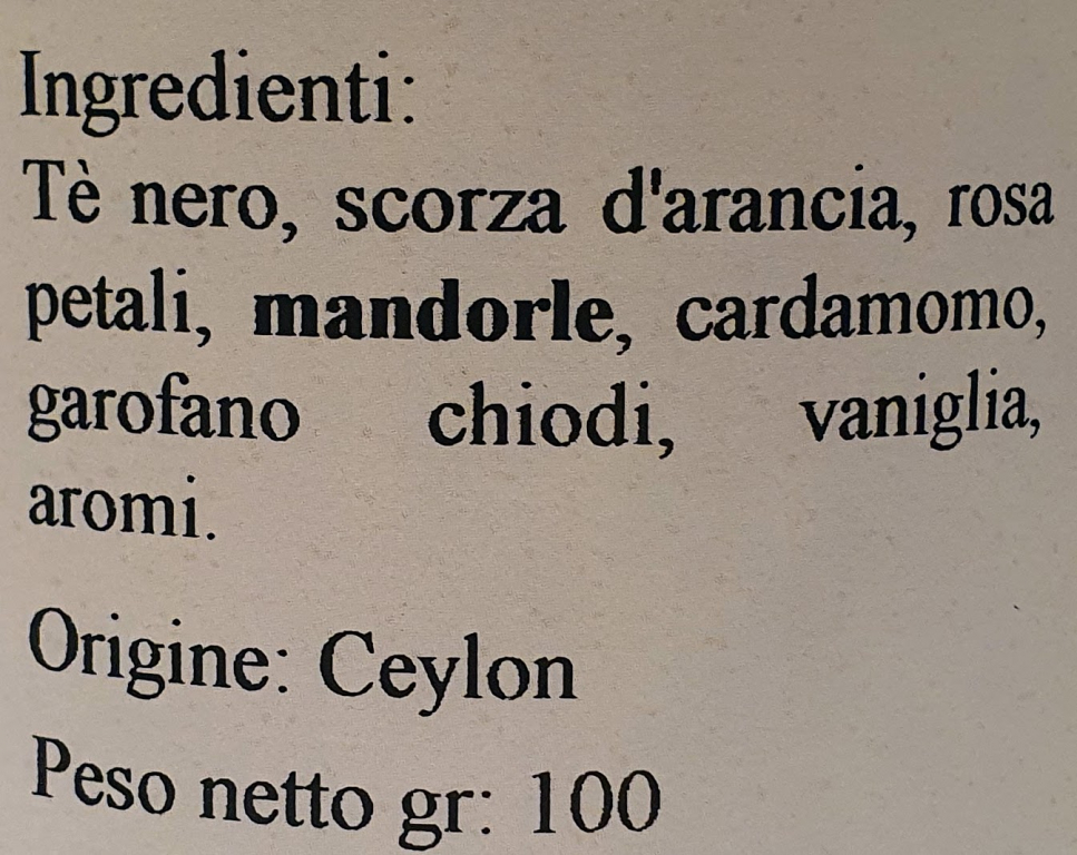ingredienti: te nero origine ceylon, chiodi di garofano, petali di rosa, mandorle, scorza di arancia, cardamomo, bacche di vaniglia, aromi
