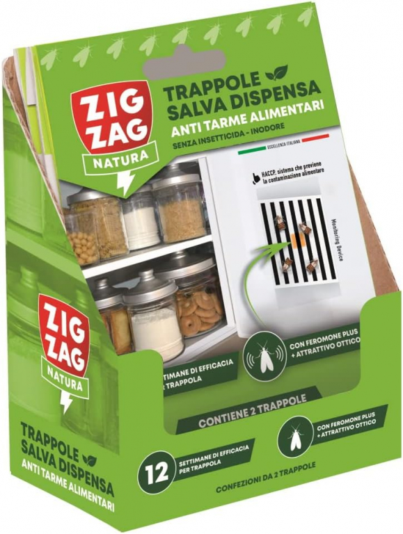 Principio di funzionamento: Il feromone specifico per le farfalline del cibo, ben visibile al centro della superficie collosa, attrae e cattura il maschio della specie, impedendo così la fecondazione della femmina e il proliferare di questi insetti nella dispensa.