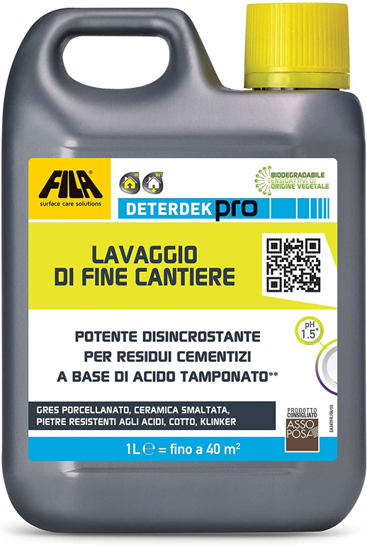 Pulisce a fondo i pavimenti esterni; disincrosta e pulisce contemporaneamente perché ricco di tensioattivi Deterdek Pro di FILA è efficace contro le macchie di ruggine Ideale per cotto, klinker, gres porcellanato, ceramica smaltata, pietre resistenti agli acidi